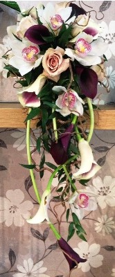 Bespoke Bridal Bouquet created on a frame with Cynbidium Orchids, Purple and Two tone Calla Lily and soft nude Roses intertwined with contorted willow and soft ruscus.